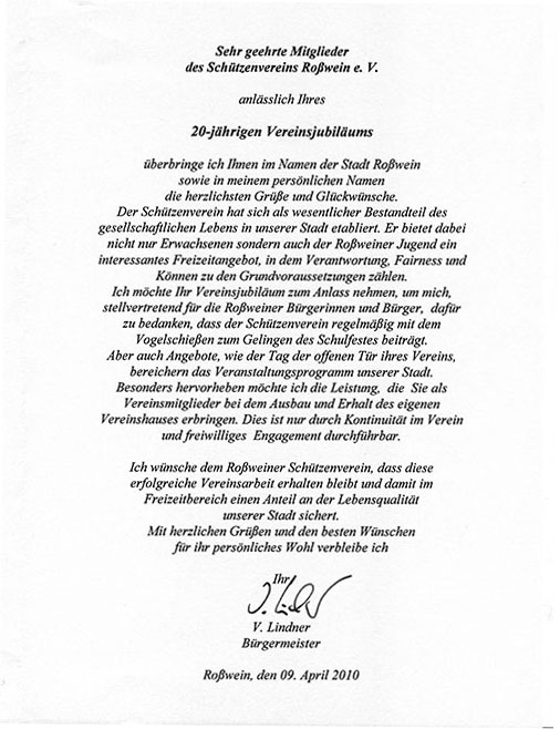 Am 09. April 2010 jährte sich die offizielle Anerkennung des Schützenverein Roßwein als eingetragener Verein zum 20. Mal. Für uns als Verein war dieses Jubiläum Anlass für eine vereinsinterne Geburtstagsfeier, zu der auch für den Verein wichtige Unterstützer eingeladen wurden. Die Festrede unseres Vorsitzenden, Peter Staer, zeigte allen Anwesenden noch einmal, welche beachtlichen ideellen, sportlichen und materiellen Werte durch die Vereinsmitglieder in den vergangenen 20 Jahren geschaffen worden. Darauf können alle Beteiligten sehr stolz sein! Unser Bürgermeister, Veit Lindner, überbrachte neben seinen persönlichen Glückwünschen auch die der Stadt Roßwein und in einer weiteren Funktion ebenso die des Kreissportbundes Mittelsachsen. Wir haben uns sehr darüber gefreut und bedanken uns recht herzlich.
